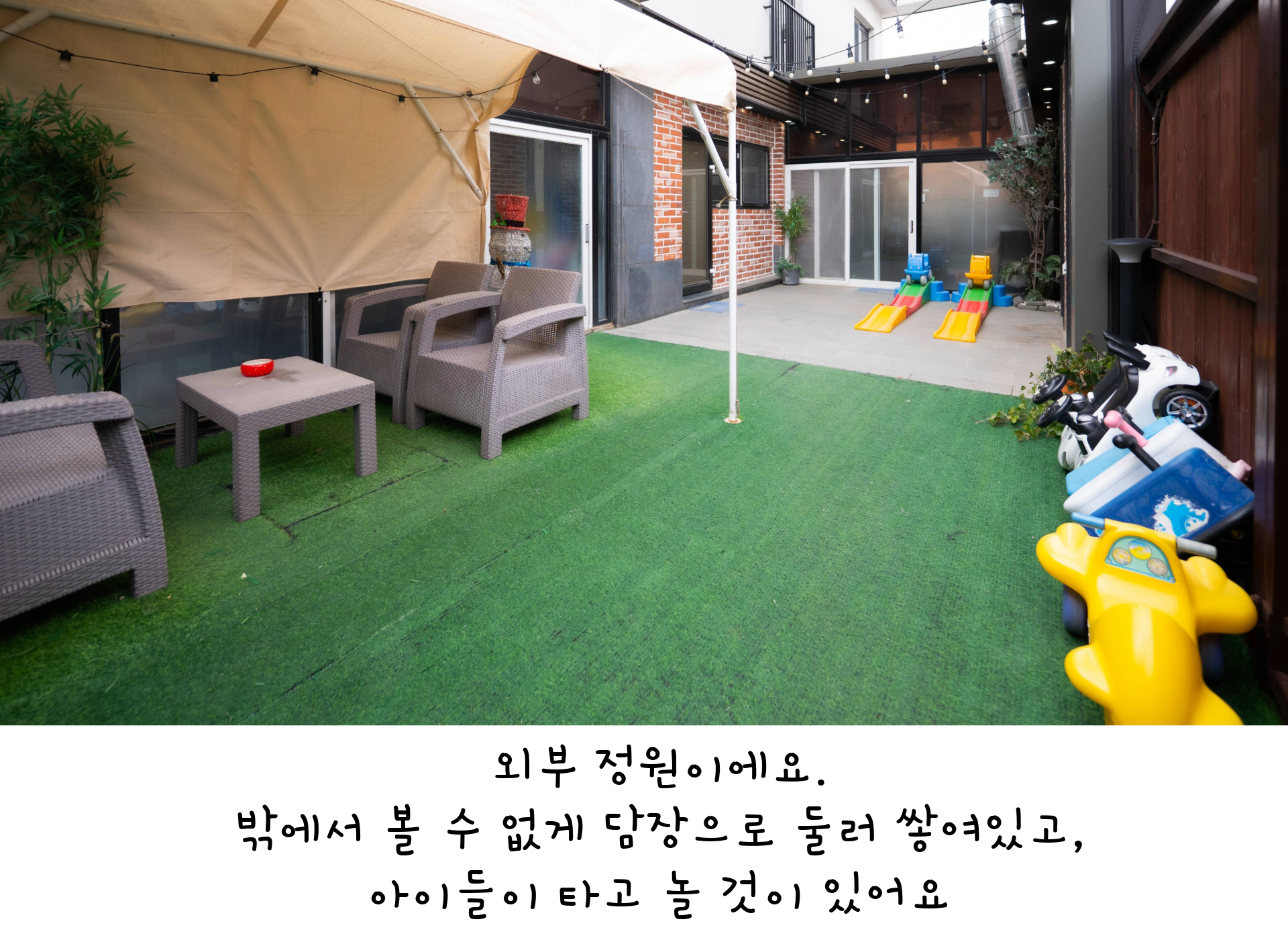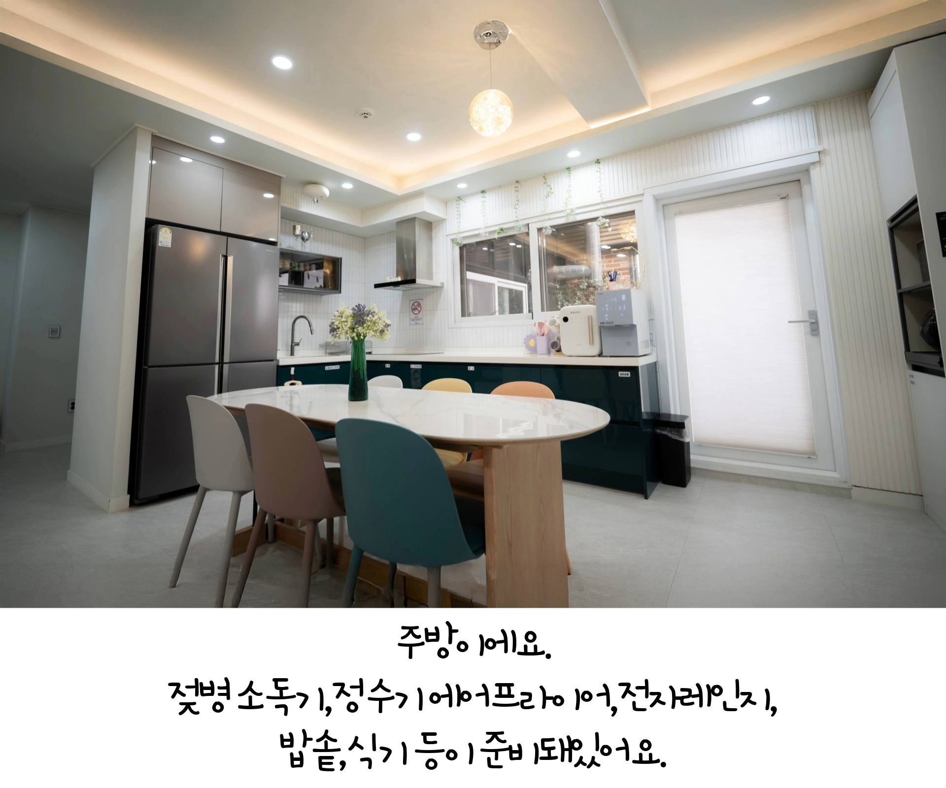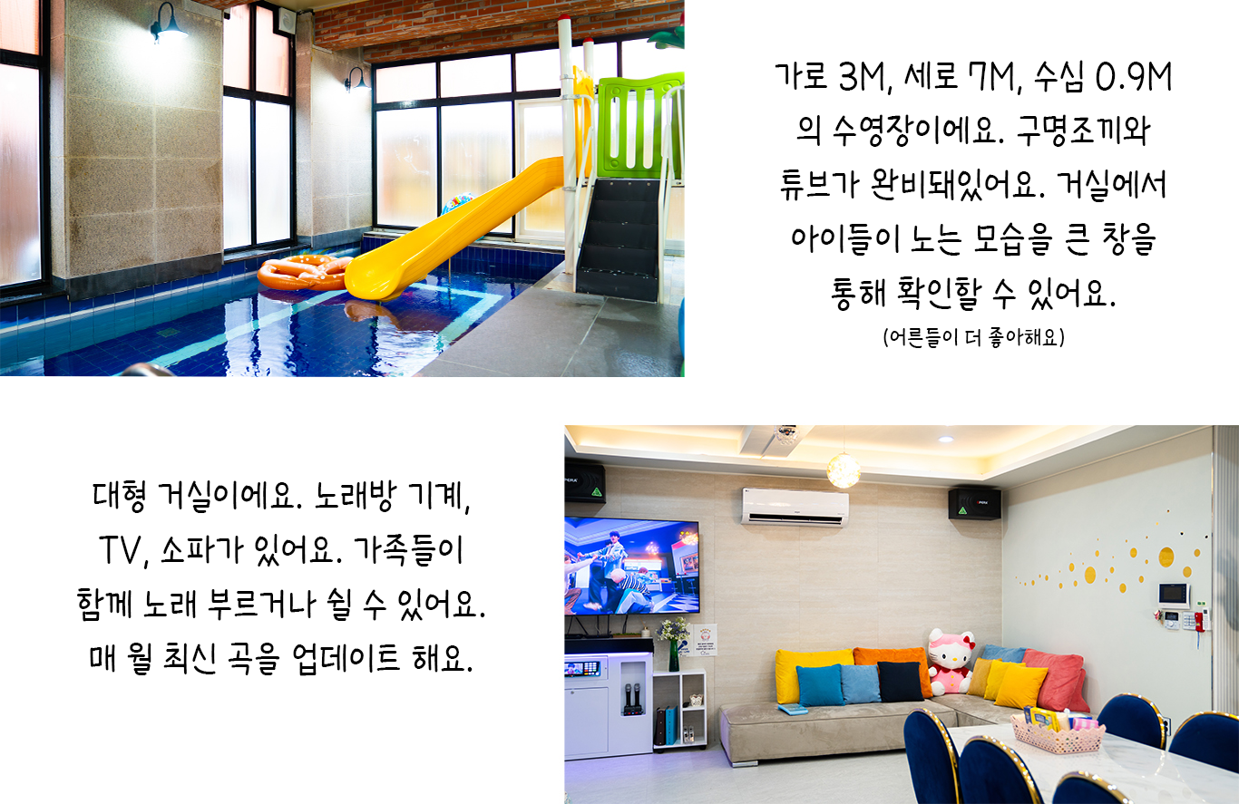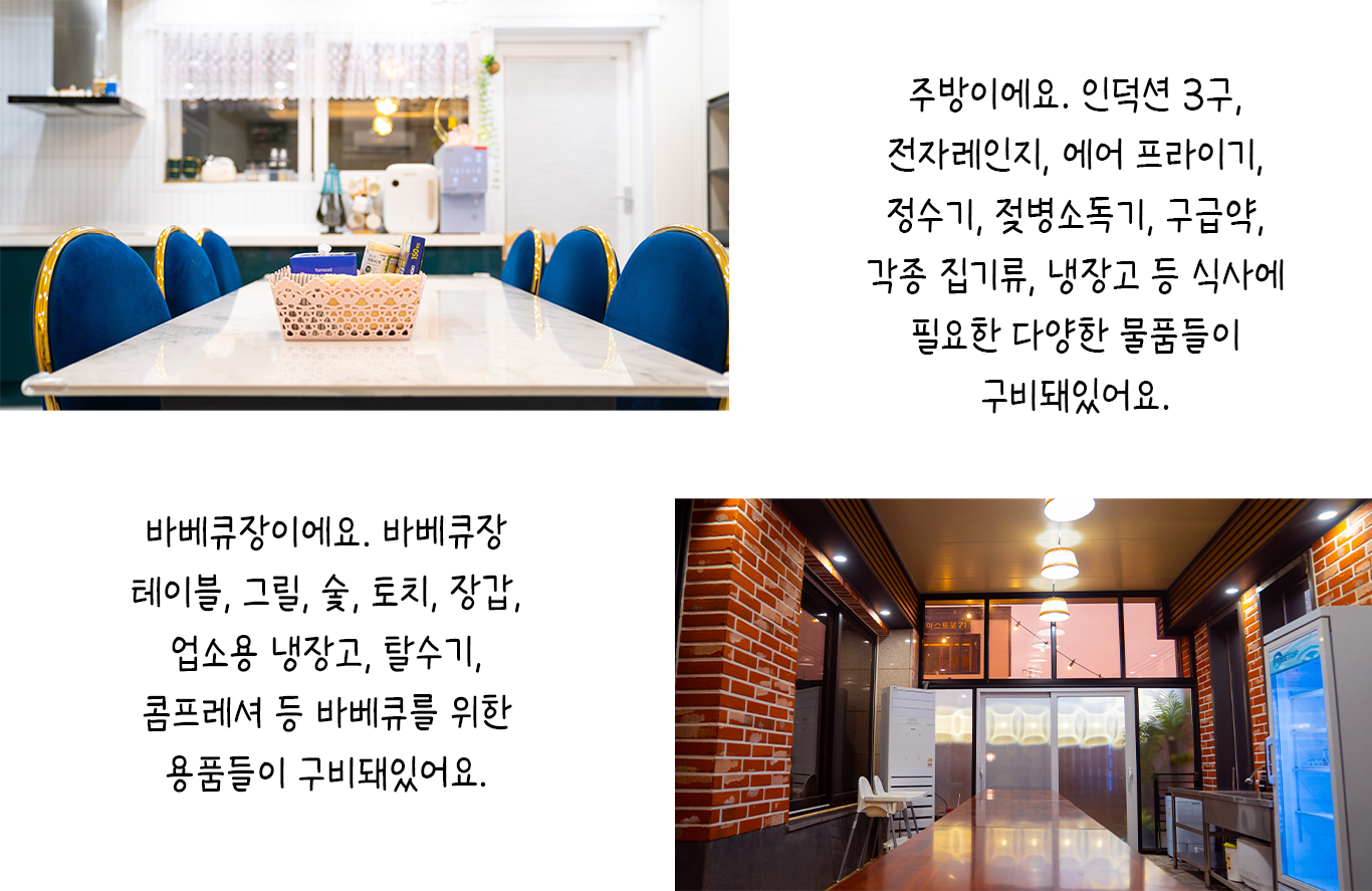 1F - 대형 거실, 노래방 기계, 미러볼, TV, 퀸침대 1, 화장실, 드라이기, 전기밥솥, 전자레인지, 에어 프라이기, 소파, 얼음 정수기, 냉난방기, 냉장고, 식기류, 인덕션 3구, 전기 포트, 구급함, 젖병 소독기, 와이파이
