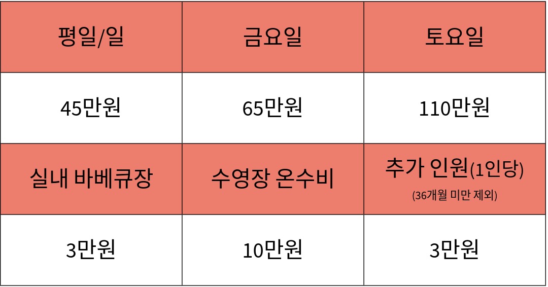 기준 인원 초과 시 1인 30,000원의 추가 요금이 발생합니다.